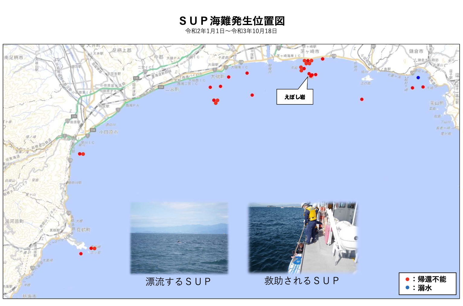 Water Sports SUP海難発生件数激増!! 2021.10.21 10月に入り北風が強い日も増えて 帰還不能者が激増しています。 ※湘南海上保安署集計データより 安全にSUPを楽しむために 波や風が強い日は中止、中断、携帯電話の携行、暗い時間の出航葉は控える ライフジャケット着用など SUPルール&マナー&心得を遵守しましょう。 SUPルール&マナー&心得 http://nsachigasaki.blog.fc2.com/blog-entry-249.html